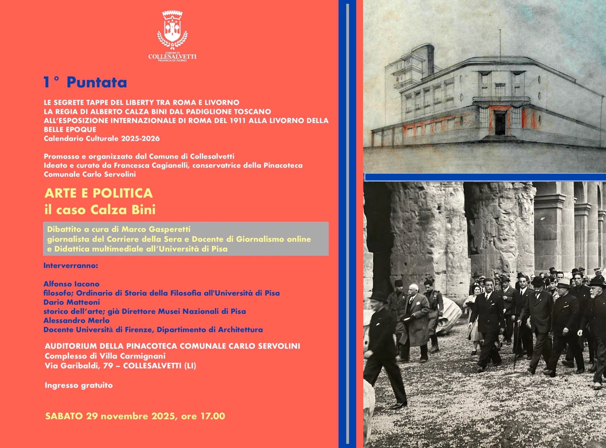 L’appuntamento, dal titolo Le segrete tappe del Liberty tra Roma e Livorno. La regia di Alberto Calza Bini dal Padiglione Toscano dell’Esposizione Internazionale di Roma del 1911 alla Livorno della Belle Époque, si terrà sabato 29 novembre 2025, alle ore 17.00, presso l’Auditorium della Pinacoteca Comunale Carlo Servolini (Complesso di Villa Carmignani, via Garibaldi 79, Collesalvetti). L’ingresso è gratuito.